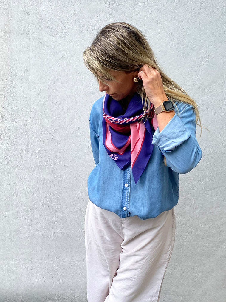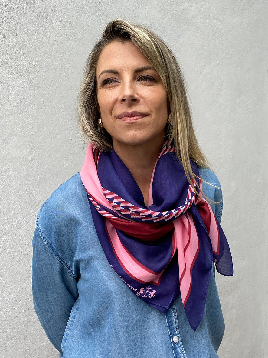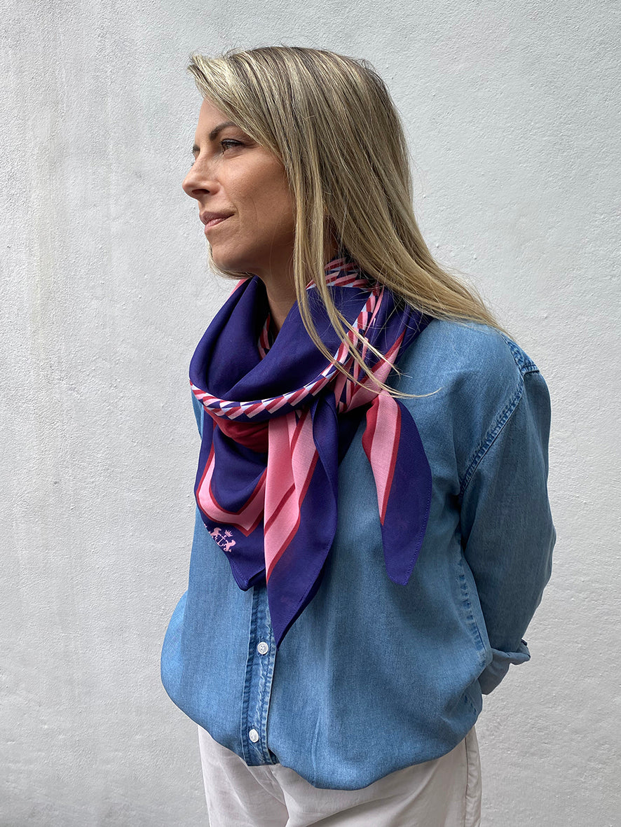 The Forbes is luxuriously soft, featuring an abstract pattern in navy, pale blue, pink, and burgundy that folds beautifully and pairs effortlessly with countless looks.