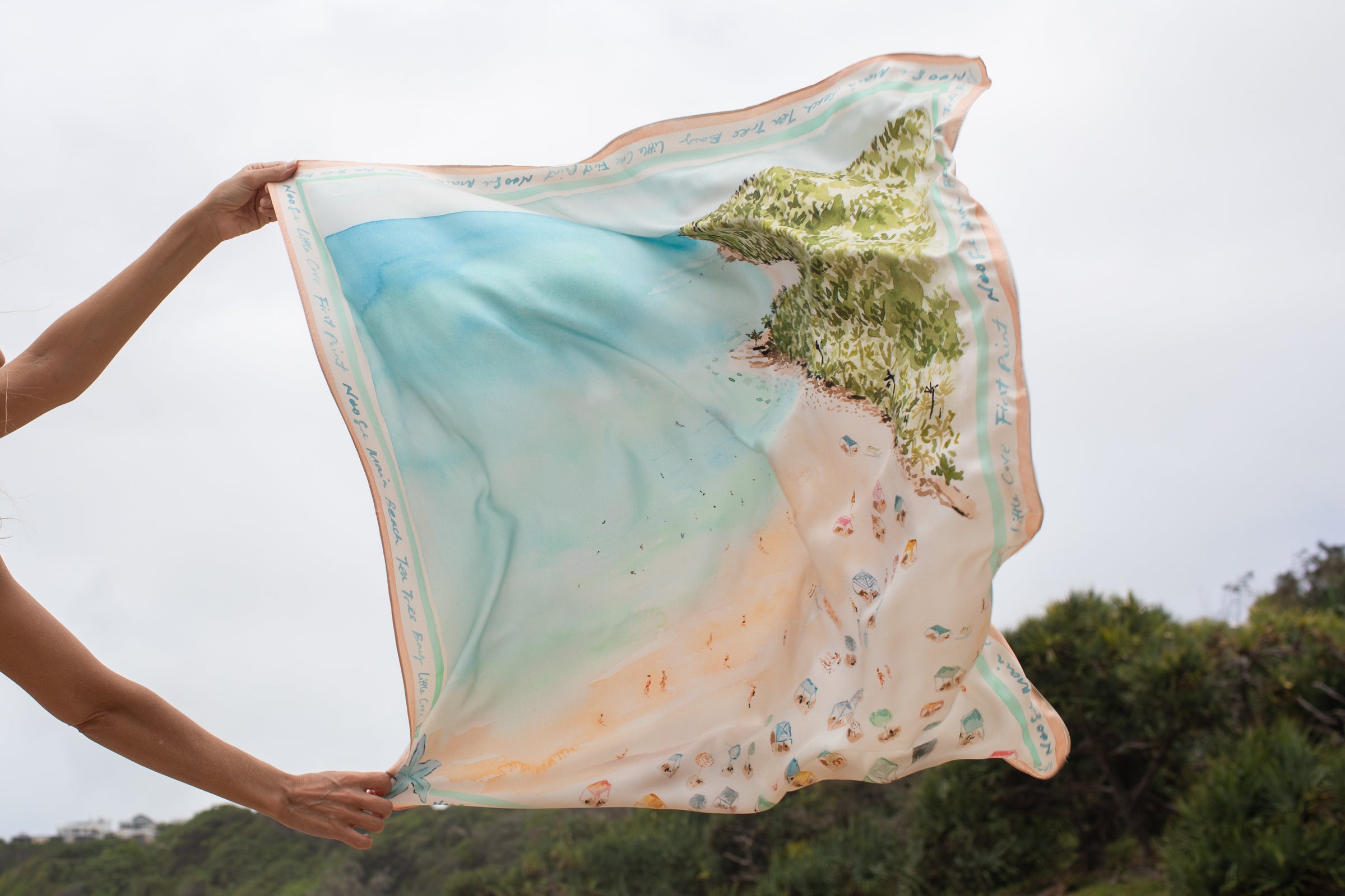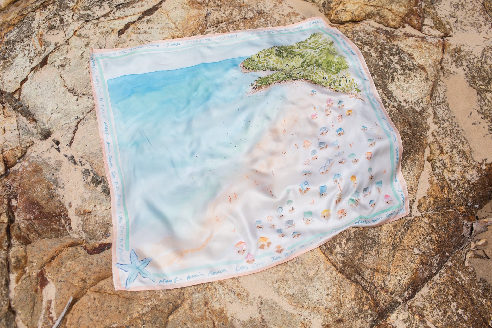 The Noosa Large Silk Scarf by Cass Deller is inspired by Noosa's iconic coastline, this large silk scarf features Cass Deller's hand-painted aerial view of turquoise waters, sandy shoreline and colourful beach umbrellas. Printed on luxurious silk with a beautiful fluid drape, it captures the effortless, laid back elegance of Noosa.