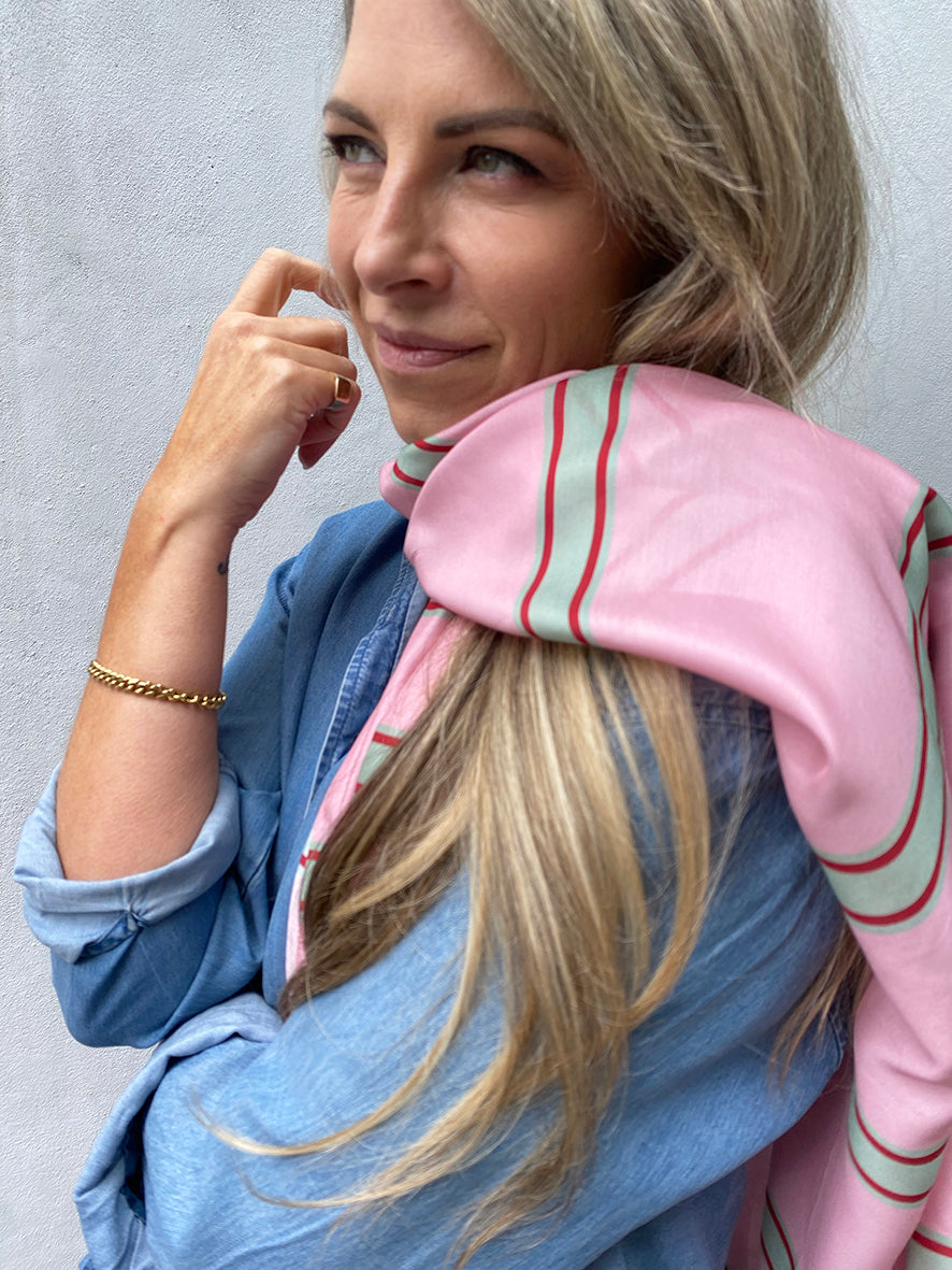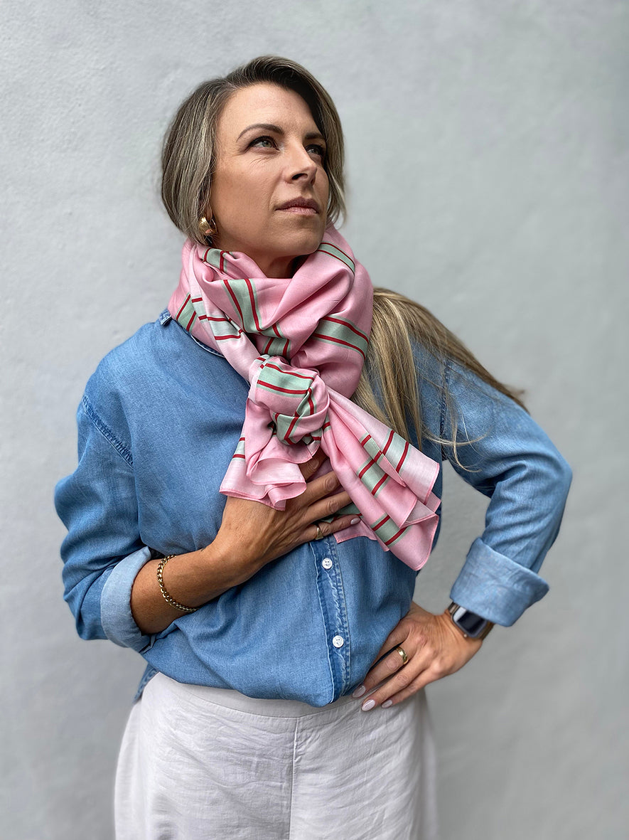 Experience the beauty of New Zealand design with this versatile, extra large scarf. This can be worn as a scarf, wrap or sarong. Soft pink and green stripes bring a playful sophistication to this versatile piece. Crafted from a luxurious blend of Silk and Rayon, it feels soft, light, and effortlessly elegant.